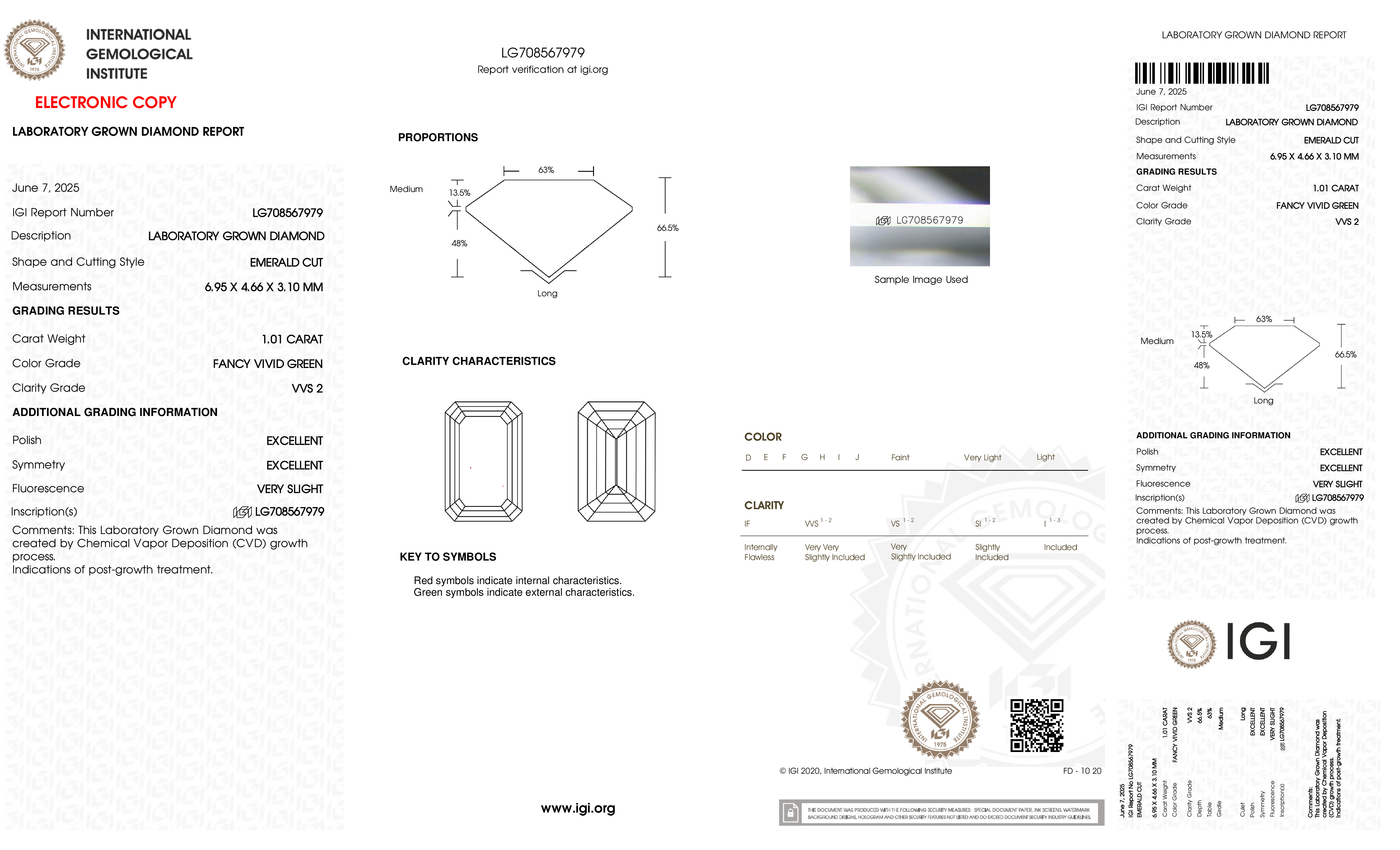 This Certified 1.01 Carat 6.95 x 4.66 x 3.10 mm Green Emerald Lab Grown Diamond has been hand selected by our GIA-certified gemologists for its exceptional characteristics and rarity.
