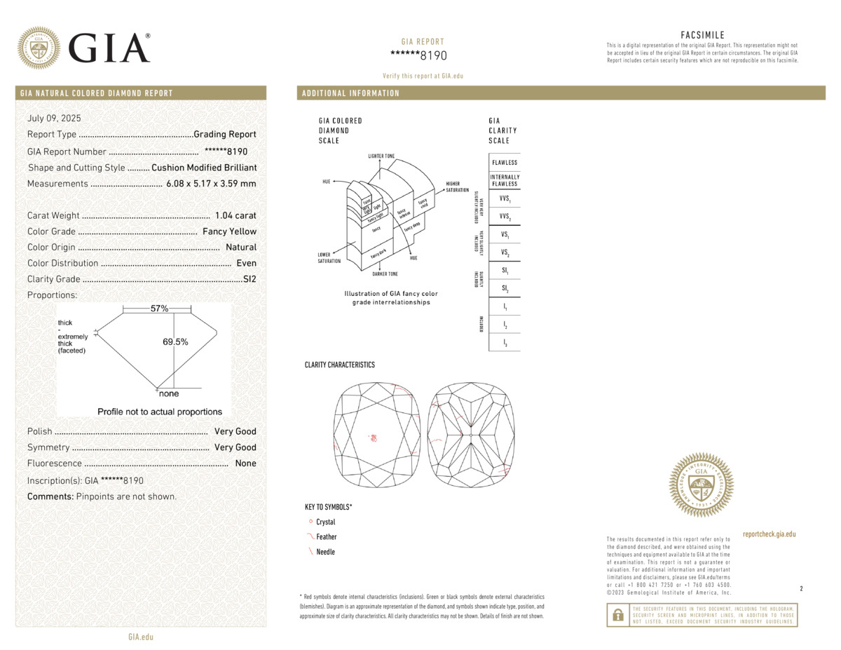 This Certified 1.04 Carat 6.08 x 5.17 x 3.59 mm Yellow Cushion Diamond has been hand selected by our GIA-certified gemologists for its exceptional characteristics and rarity.