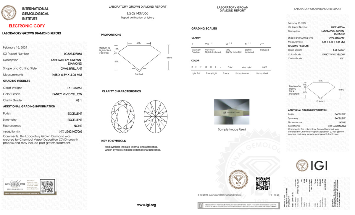 This Certified 1.61 Carat 9.55 x 6.59 x 4.06 mm Yellow Oval Lab Grown Diamond has been hand selected by our GIA-certified gemologists for its exceptional characteristics and rarity.