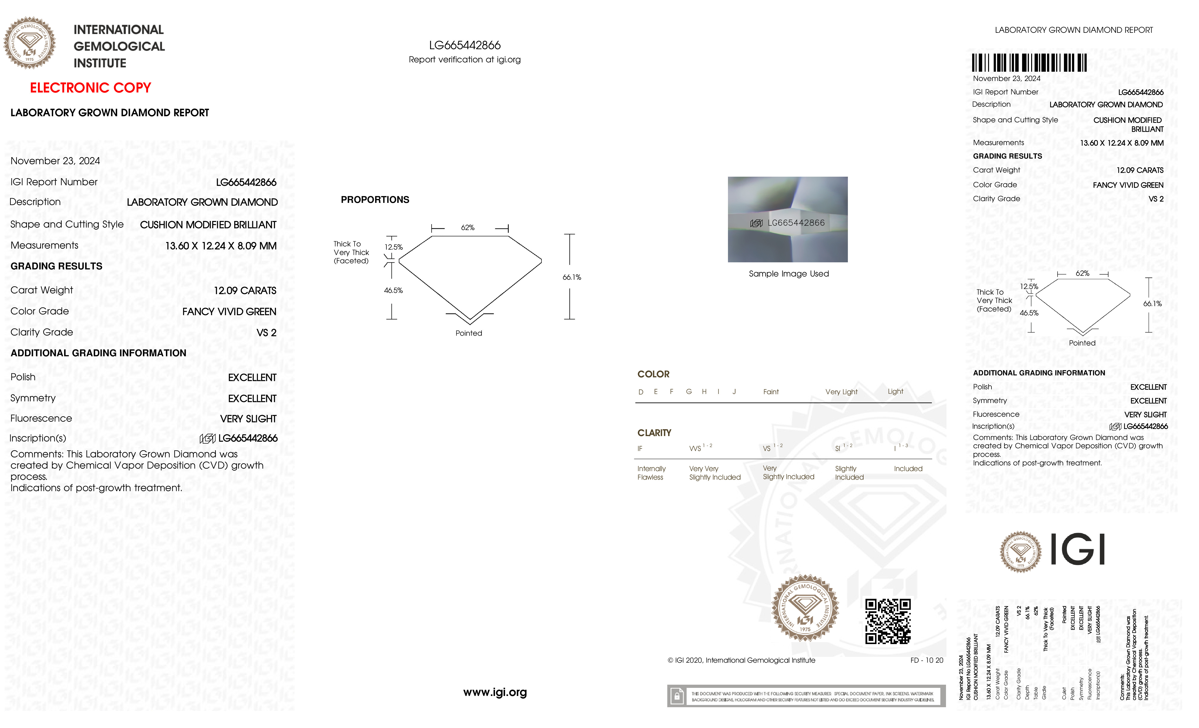 This Certified 12.09 Carat 13.60 x 12.24 x 8.09 mm Green Cushion Lab Grown Diamond has been hand selected by our GIA-certified gemologists for its exceptional characteristics and rarity.