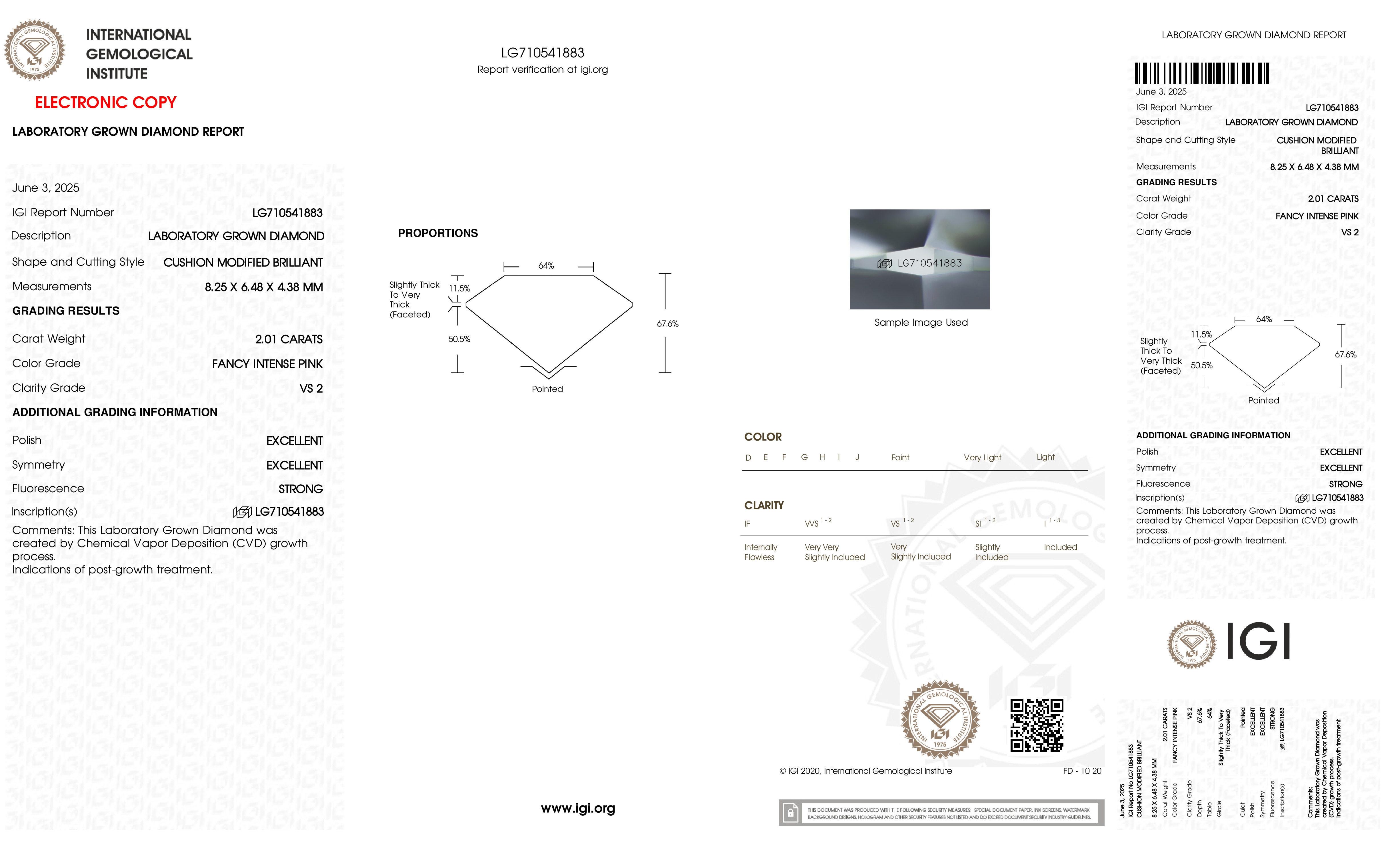 This Certified 2.01 Carat 8.25 x 6.48 x 4.38 mm Pink Cushion Lab Grown Diamond has been hand selected by our GIA-certified gemologists for its exceptional characteristics and rarity.