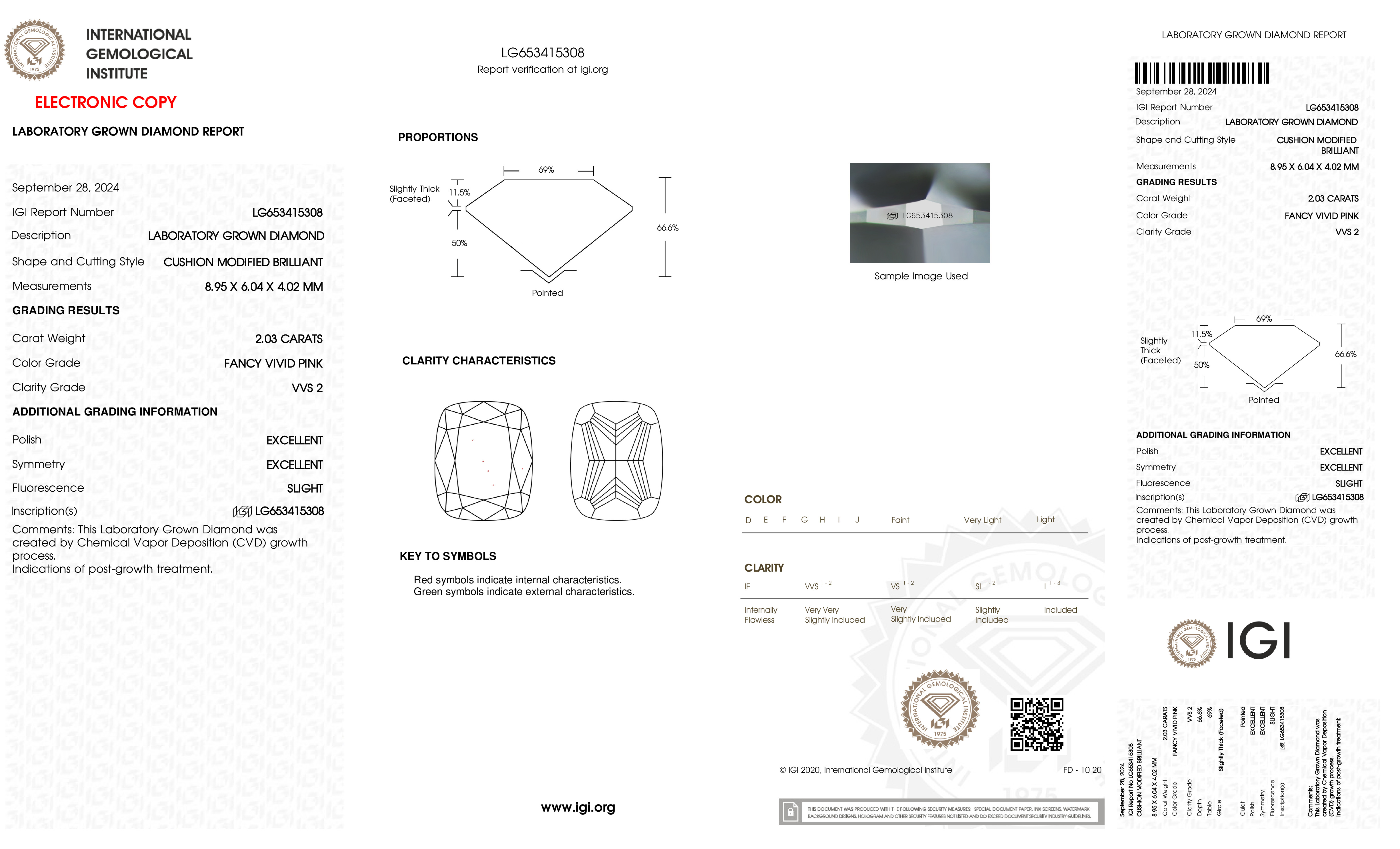 This Certified 2.03 Carat 8.95 x 6.04 x 4.02 mm Pink Cushion Lab Grown Diamond has been hand selected by our GIA-certified gemologists for its exceptional characteristics and rarity.