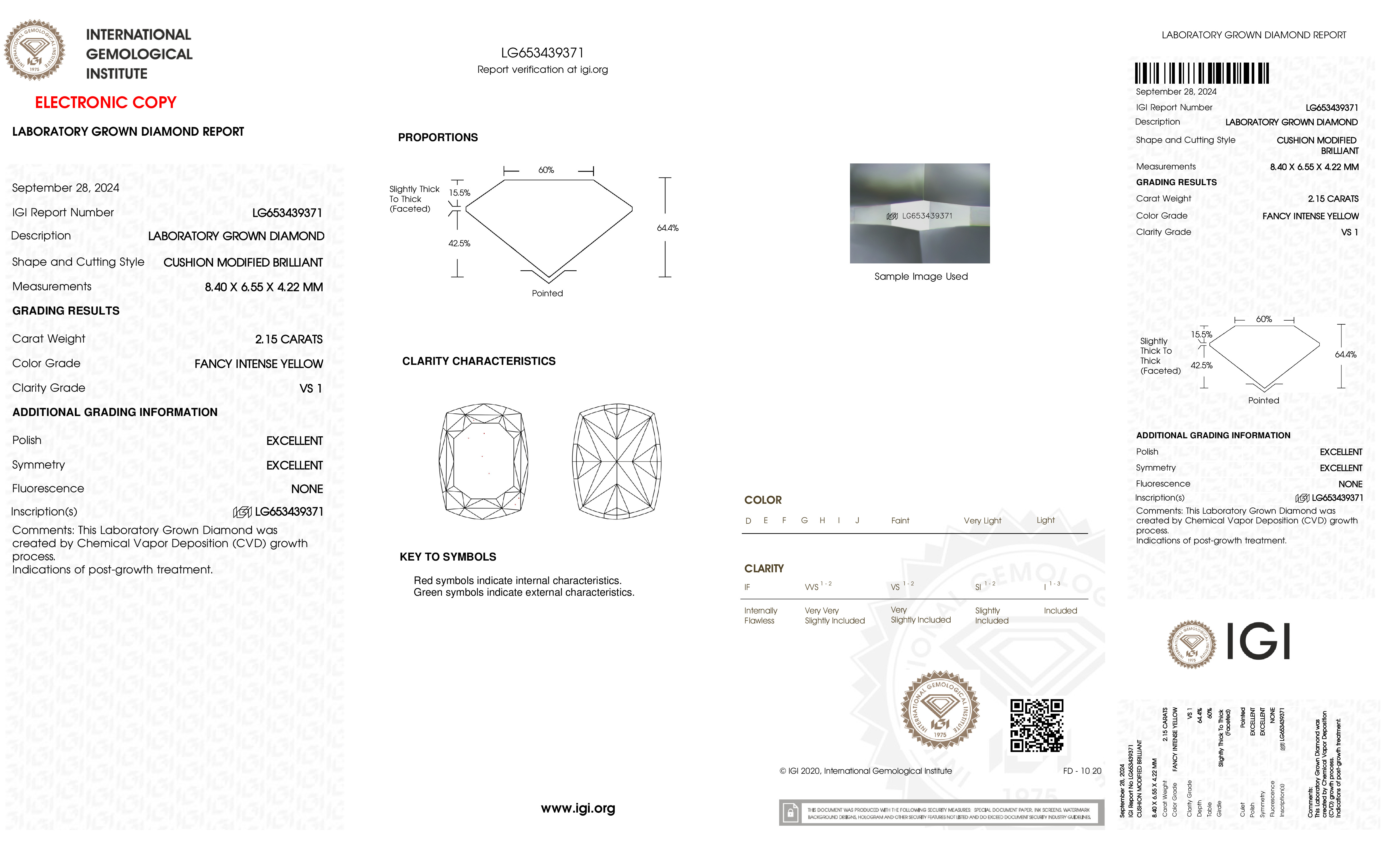 This Certified 2.15 Carat 8.40 x 6.55 x 4.22 mm Yellow Cushion Lab Grown Diamond has been hand selected by our GIA-certified gemologists for its exceptional characteristics and rarity.