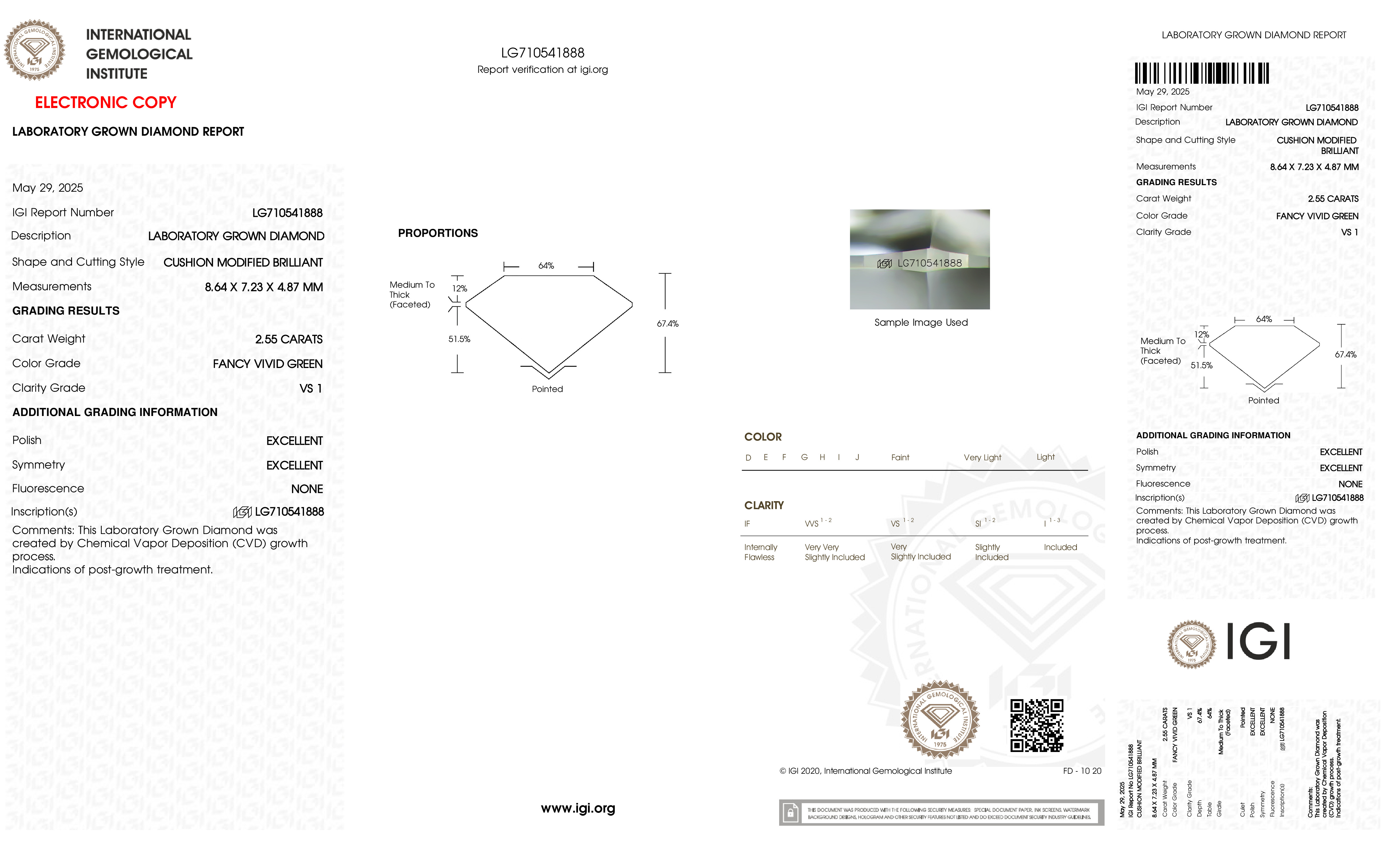 This Certified 2.55 Carat 8.64 x 7.23 x 4.87 mm Green Cushion Lab Grown Diamond has been hand selected by our GIA-certified gemologists for its exceptional characteristics and rarity.