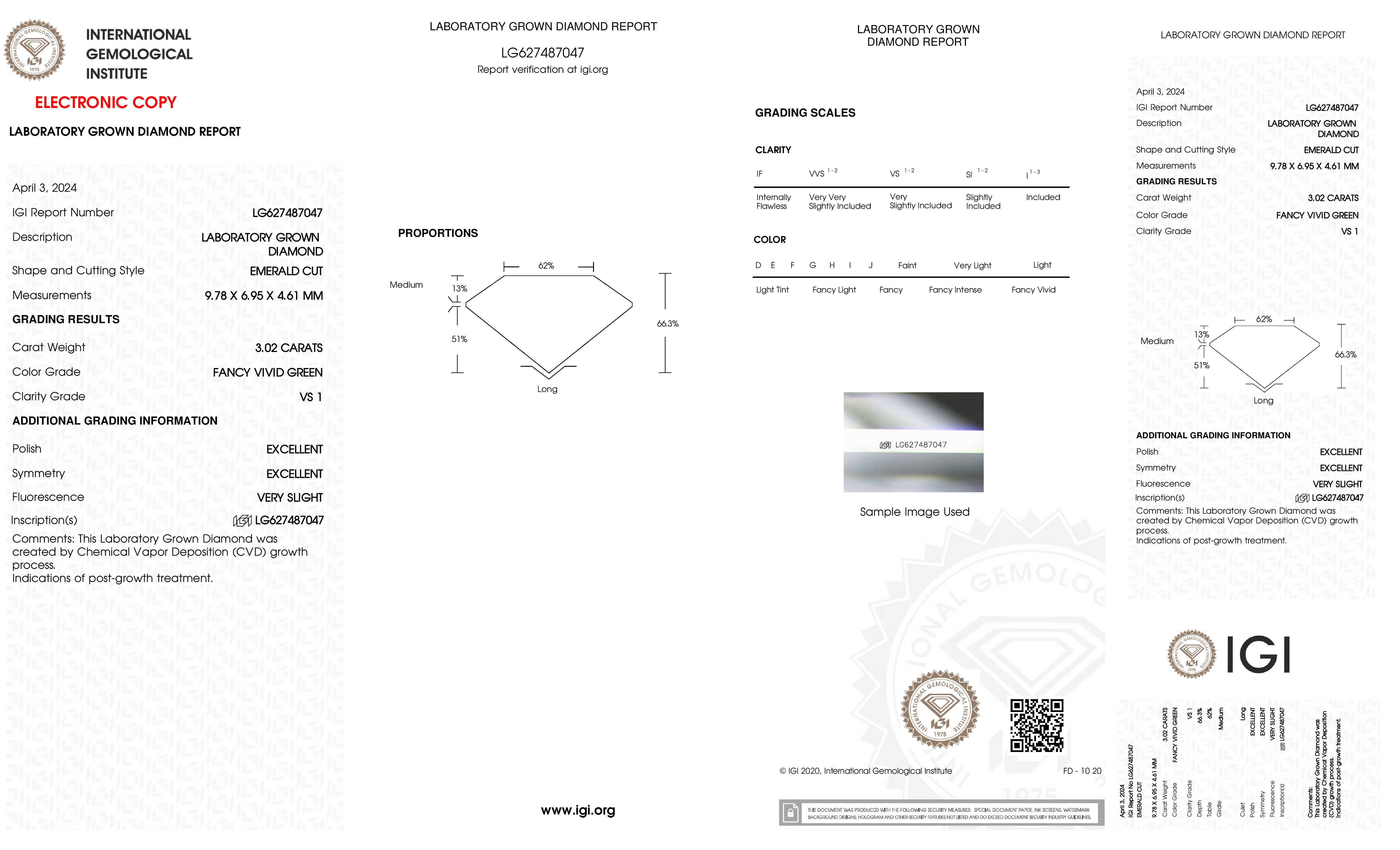 This Certified 3.02 Carat 9.78 x 6.95 x 4.61 mm Green Emerald Lab Grown Diamond has been hand selected by our GIA-certified gemologists for its exceptional characteristics and rarity.