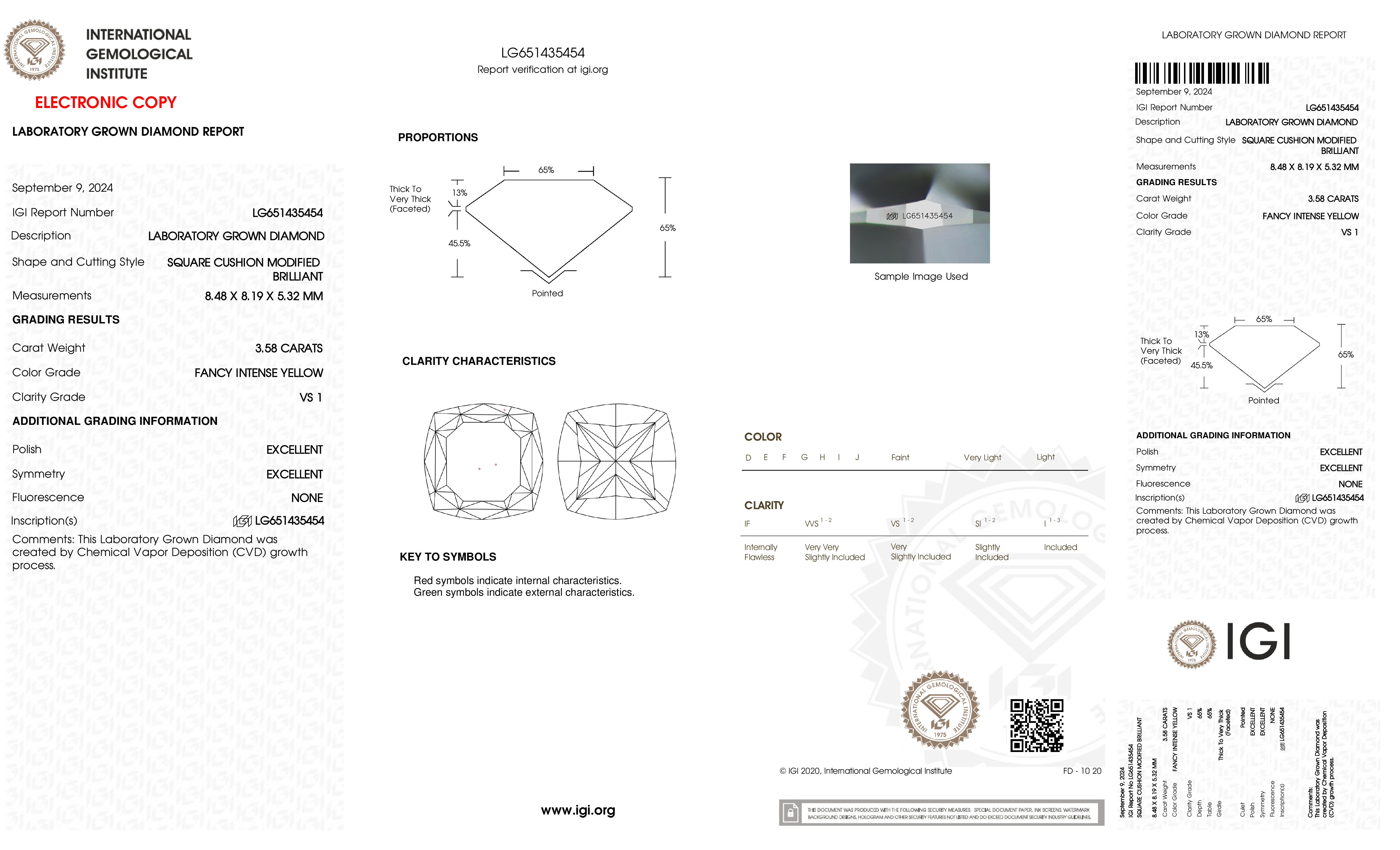 This Certified 3.58 Carat 8.48 x 8.19 x 5.32 mm Yellow Cushion Lab Grown Diamond has been hand selected by our GIA-certified gemologists for its exceptional characteristics and rarity.