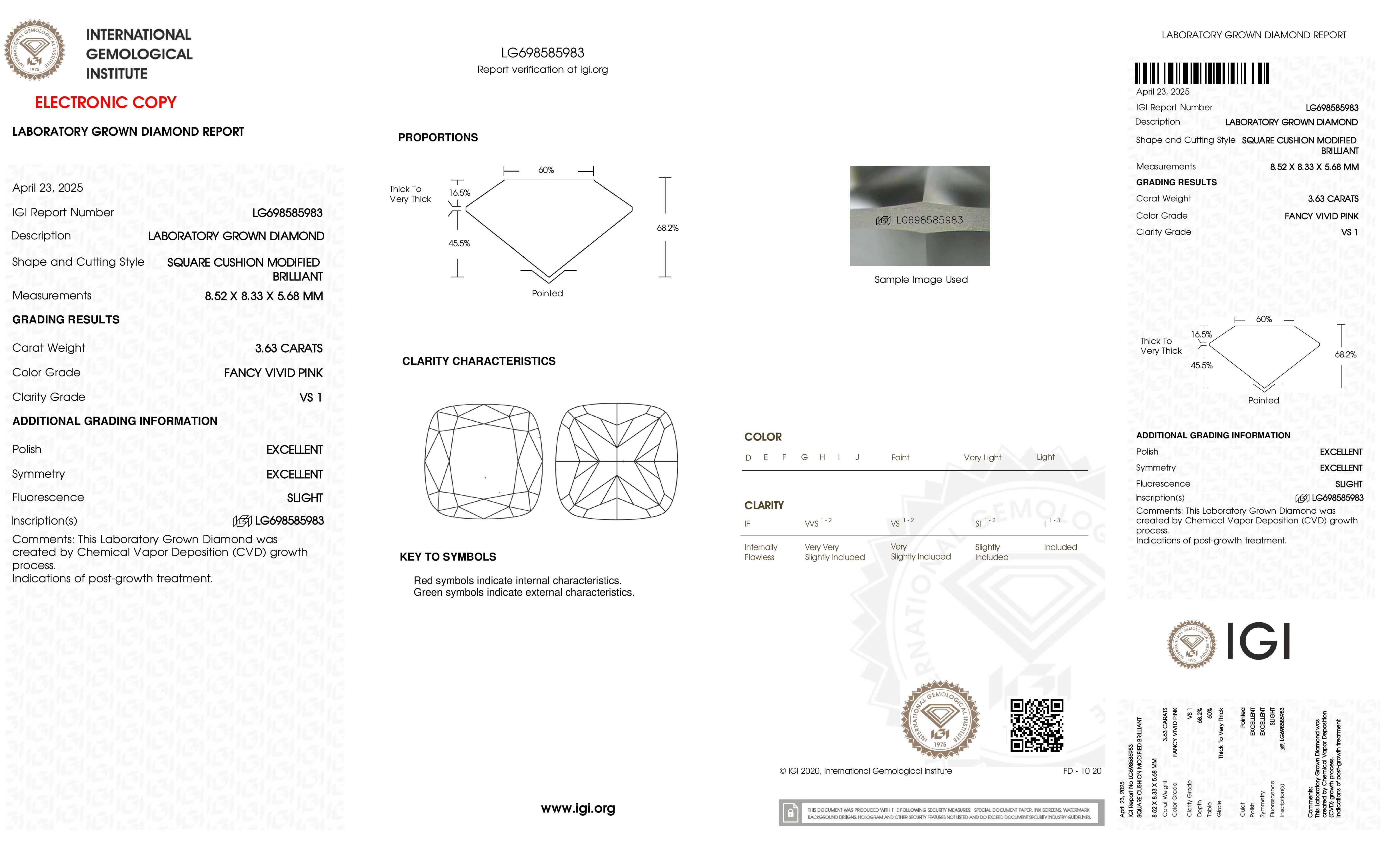 This Certified 3.63 Carat 8.52 x 8.33 x 5.68 mm Pink Cushion Lab Grown Diamond has been hand selected by our GIA-certified gemologists for its exceptional characteristics and rarity.