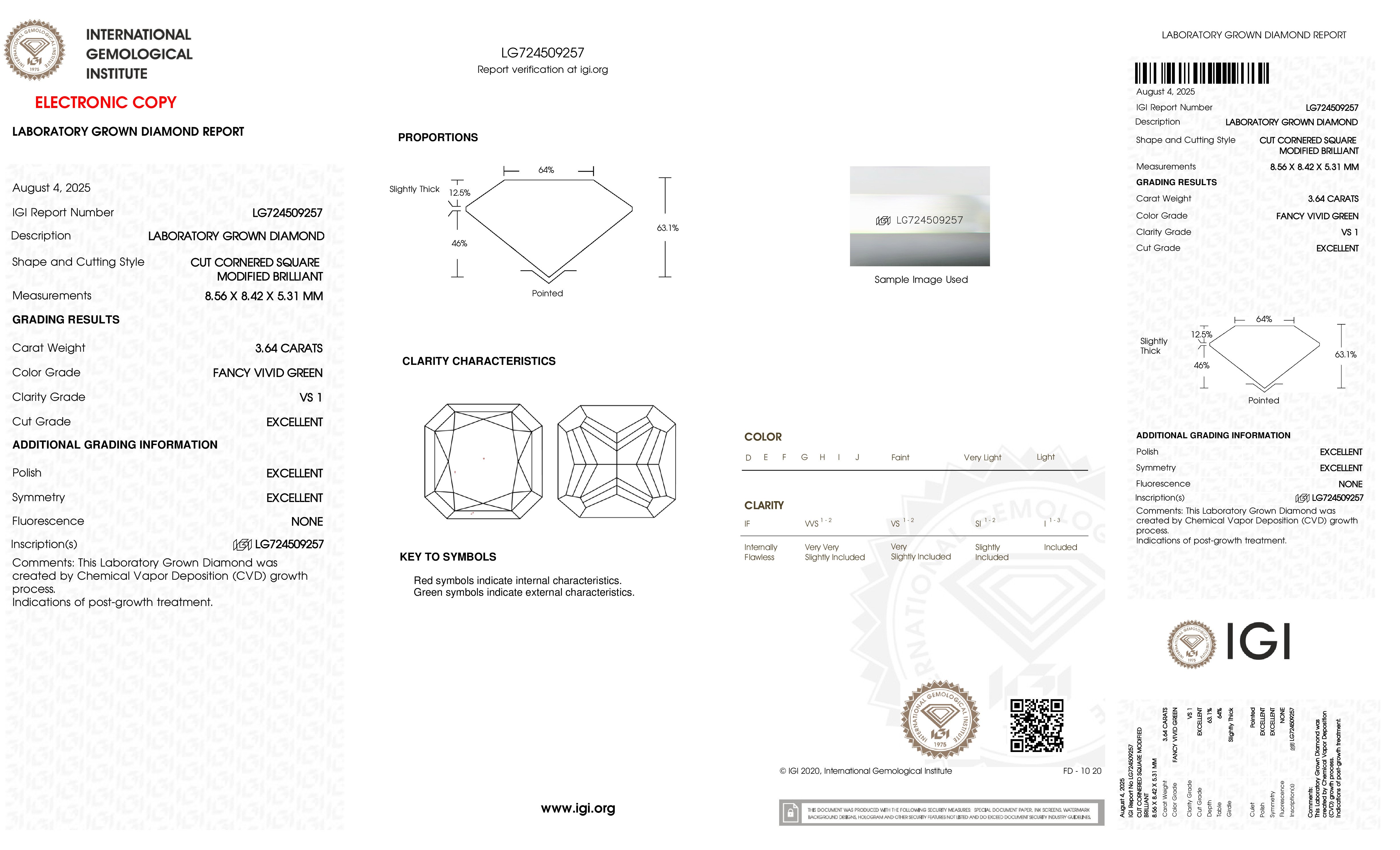 This Certified 3.64 Carat 8.56 x 8.42 x 5.31 mm Green Radiant Lab Grown Diamond has been hand selected by our GIA-certified gemologists for its exceptional characteristics and rarity.