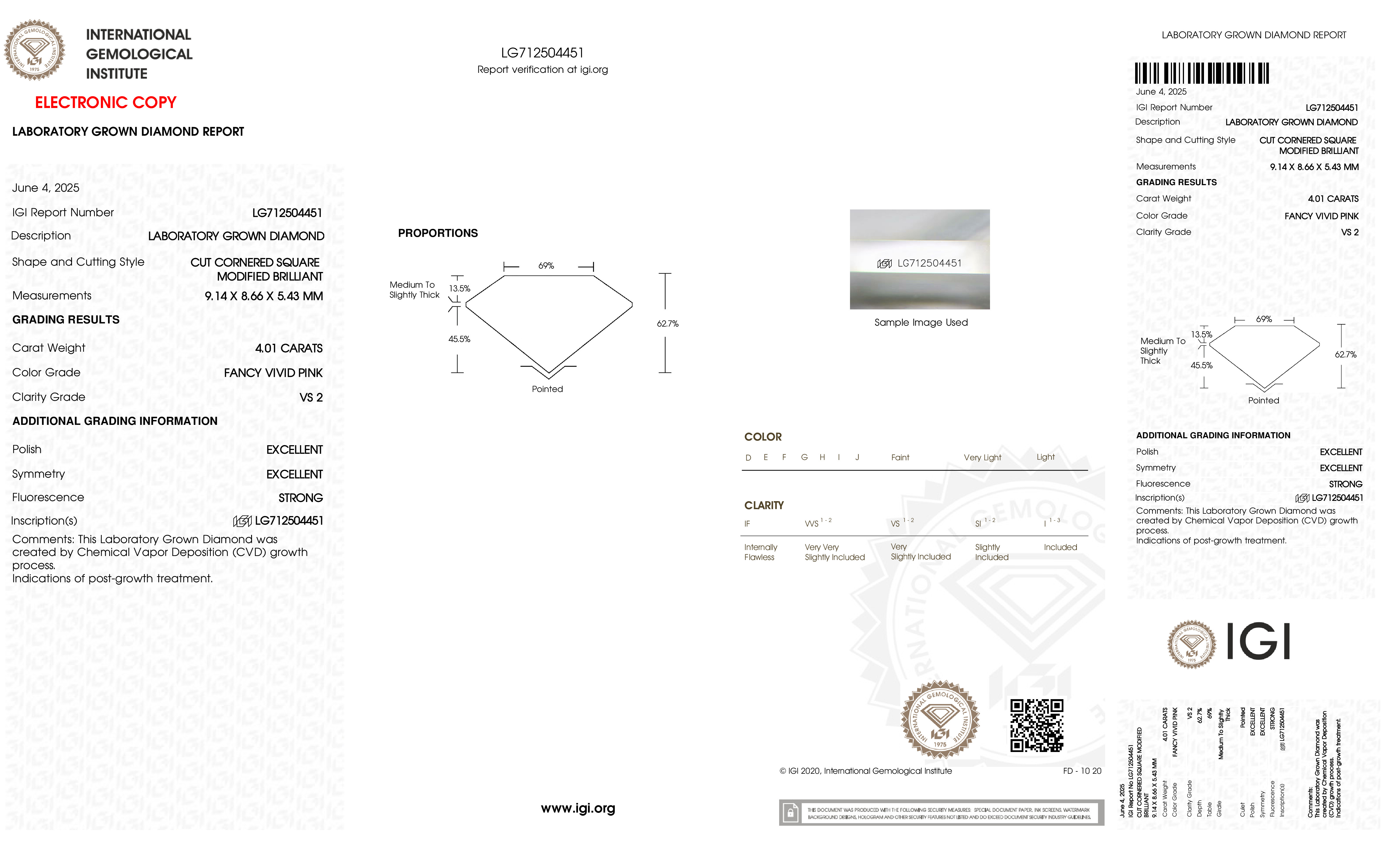 This Certified 4.01 Carat 9.14 x 8.66 x 5.43 mm Pink Cushion Lab Grown Diamond has been hand selected by our GIA-certified gemologists for its exceptional characteristics and rarity.