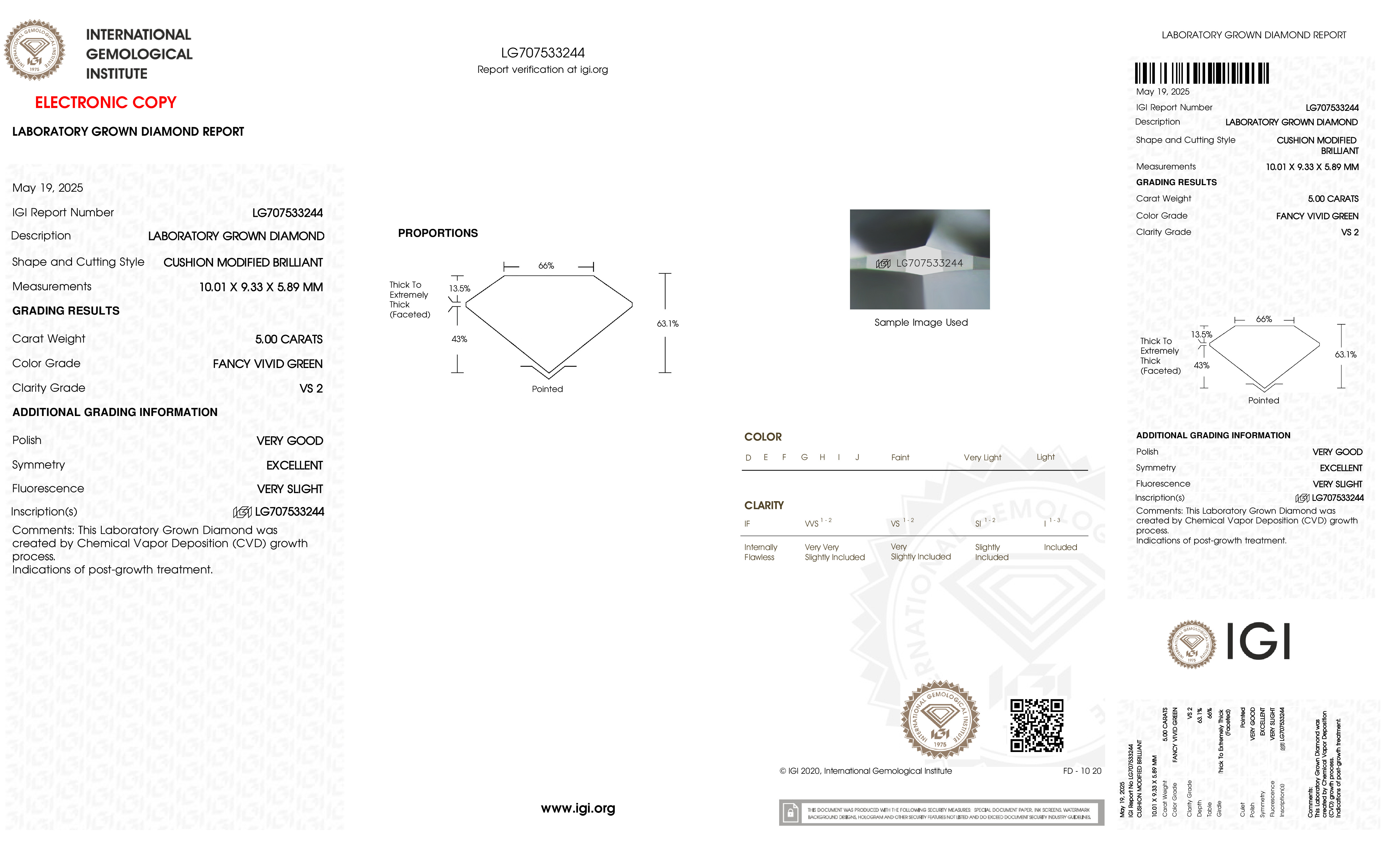 This Certified 5.00 Carat 10.01 x 9.33 x 5.89 mm Green Cushion Lab Grown Diamond has been hand selected by our GIA-certified gemologists for its exceptional characteristics and rarity.