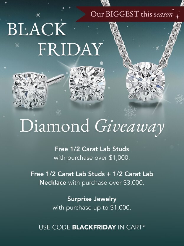 We're going all out! Receive jewelry with every order—up to $700 in lab diamond jewelry when you spend $1,000+. Use code BLACKFRIDAY in cart. *Terms Apply.