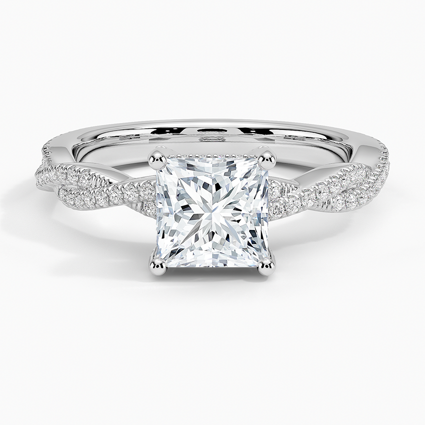 This beautiful ring features a shimmering strand of pavé diamonds entwined with a lustrous ribbon of precious metal and extra diamond accents along the gallery and prongs (1/3 total carat weight).