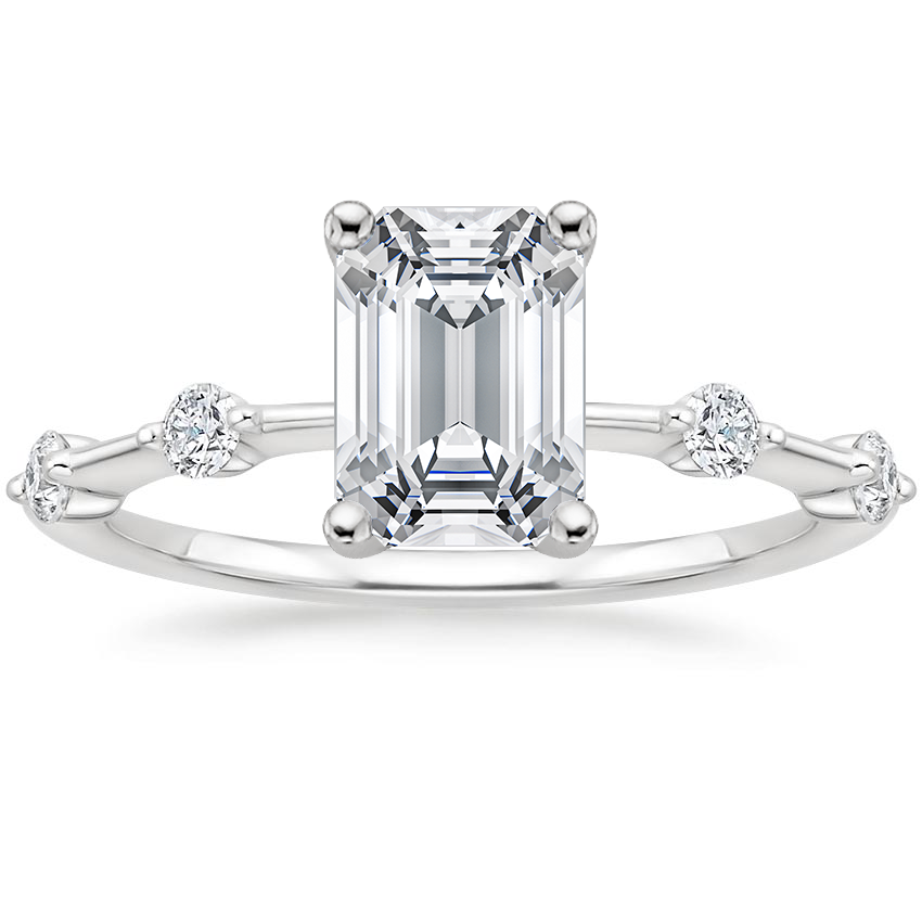 I fell in love with this ring the moment I tried it on in store. I love how thin and delicate the band itself is, and I have received numerous compliments on the band itself, with a lot of people telling me they've never seen a band like it. I also wanted an emerald cut diamond, which could've gone either way with this band and the round stones on it. My biggest hesitation was what type of wedding band to pair it with. I went with the delicate Versailles, and I have ZERO regrets!