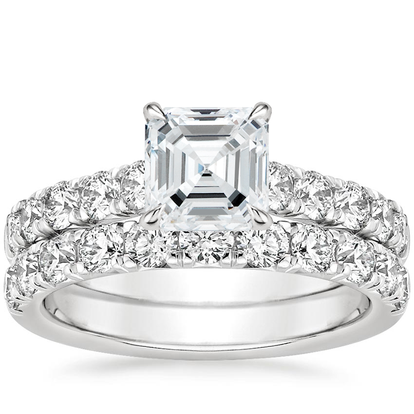 This luminous ring features sleek claw prongs around the center gem, and shimmering French pavé set diamonds along the band. The matching wedding band sparkles with thirteen glamorous French pavé diamonds, a style of setting that maximizes brilliance. ... Read More