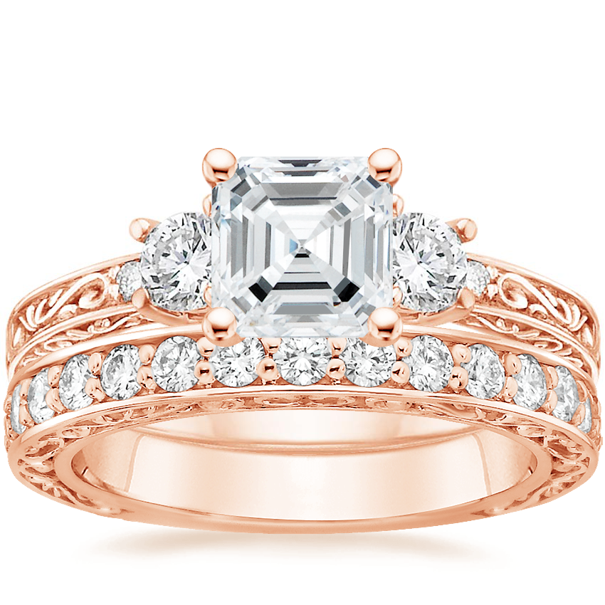 14K Rose Gold Antique Scroll Three Stone Trellis Diamond Ring (1/3 ct. tw.) with Antique Scroll Diamond Ring (2/5 ct. tw.)