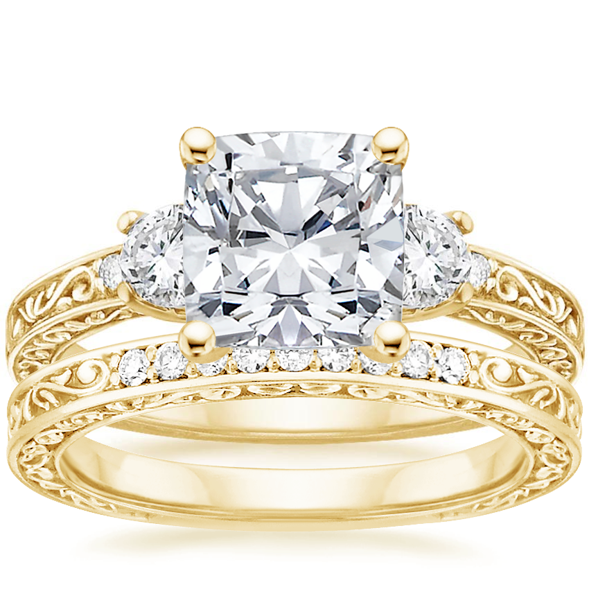 18K Yellow Gold Antique Scroll Three Stone Trellis Diamond Ring (1/3 ct. tw.) with Delicate Antique Scroll Diamond Ring (1/15 ct. tw.)
