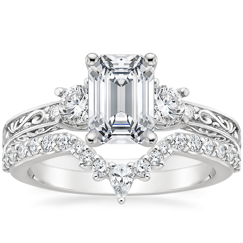14K White Gold Antique Scroll Three Stone Trellis Diamond Ring (1/3 ct. tw.) with Luxe Lunette Diamond Ring (1/3 ct. tw.)