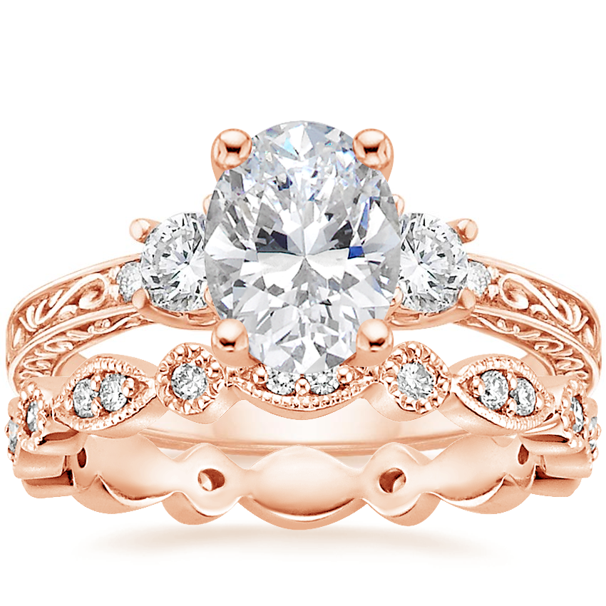 14K Rose Gold Antique Scroll Three Stone Trellis Diamond Ring (1/3 ct. tw.) with Tiara Eternity Diamond Ring (1/4 ct. tw.)