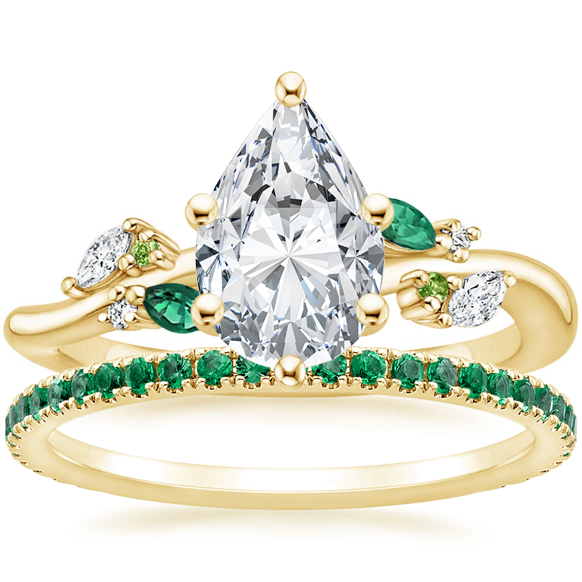 18K Yellow Gold Arden Lab Diamond Ring with Lab Emerald Accents with Luxe Ballad Emerald Ring with 1.22 Carat Pear Lab Grown Diamond