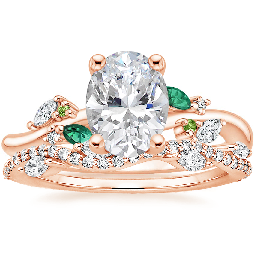 14K Rose Gold Arden Lab Diamond Ring with Lab Emerald Accents with Luxe Winding Willow Diamond Ring (1/4 ct. tw.) with 3.51 Carat Oval Lab Grown Diamond