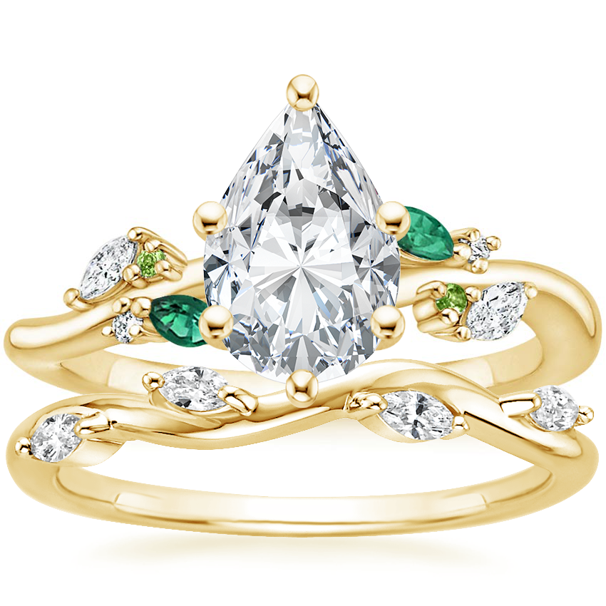 18K Yellow Gold Arden Lab Diamond Ring with Lab Emerald Accents with Winding Willow Diamond Ring with 1.22 Carat Pear Lab Grown Diamond