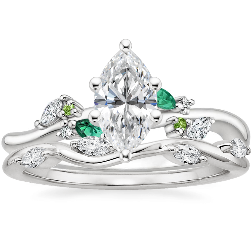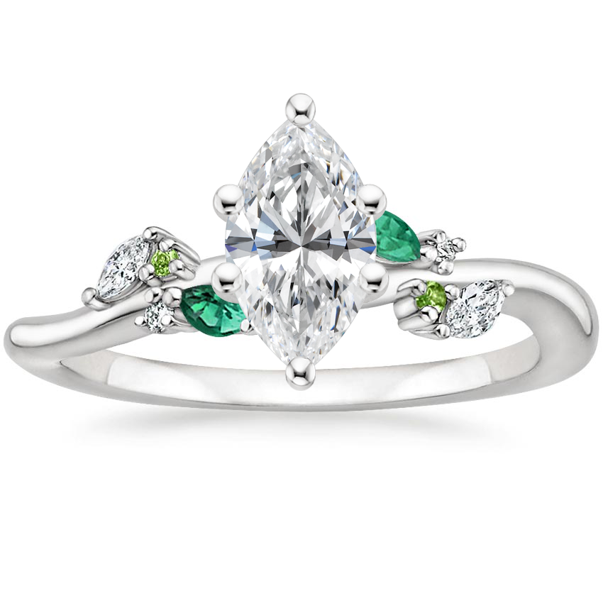 18K White Gold Arden Diamond Ring with Lab Emerald Accents with Winding Willow Diamond Ring with 0.75 Carat Marquise Diamond