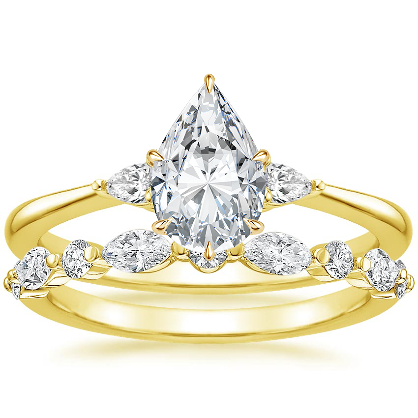 Classic artistry defines this delicate matched set which features a thin precious metal engagement ring that gently tapers towards a pear-shaped diamond accent on each side of the center gem. ... Read More
