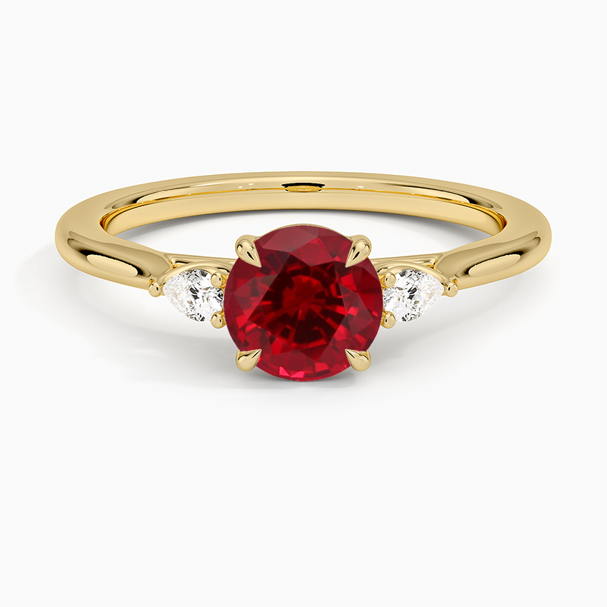 18K Yellow Gold Aria Perfect Fit Three Stone Lab Diamond Ring with 6mm Round Lab Grown Ruby