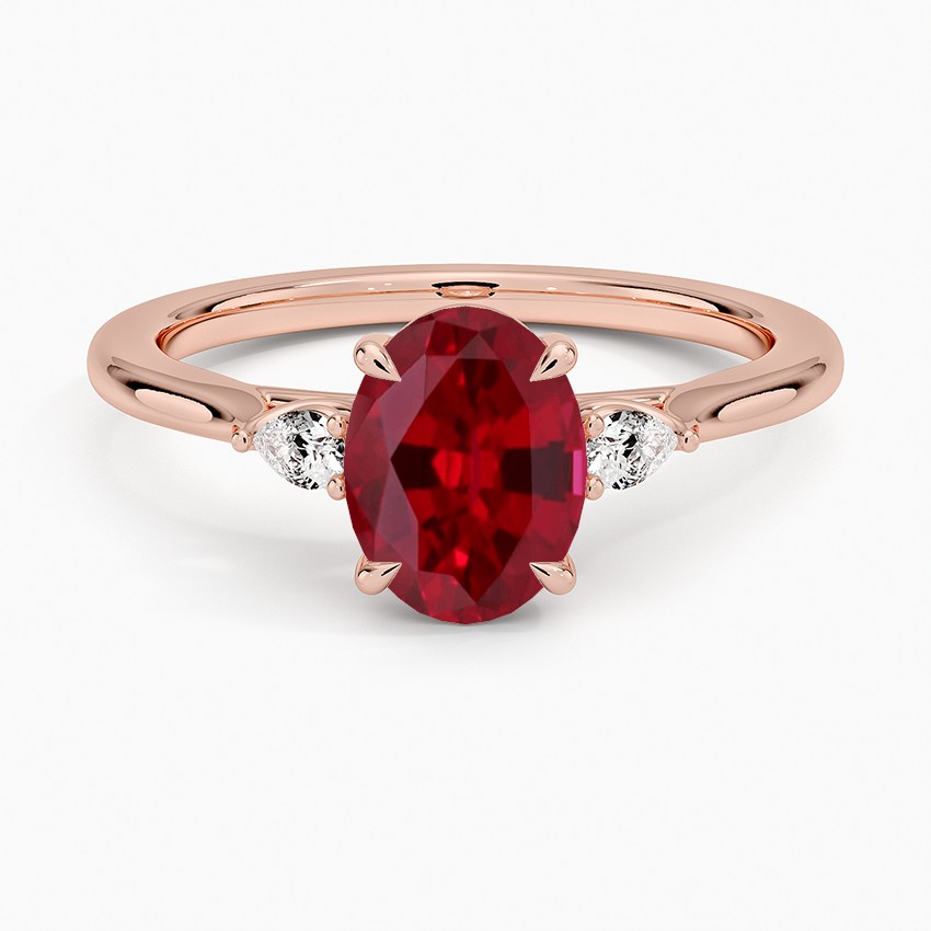 14K Rose Gold Aria Perfect Fit Three Stone Lab Diamond Ring with 8x6mm Oval Lab Grown Ruby