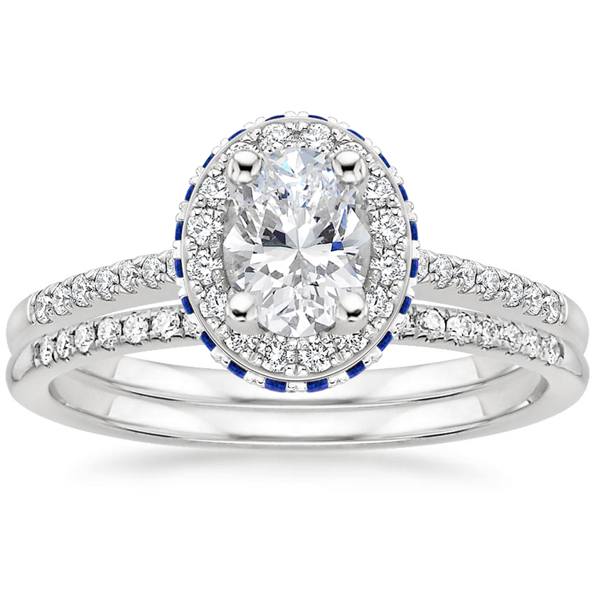 This glamorous halo bridal set features a row of vibrant blue sapphires set around the exterior edge of the halo. Additional diamonds on the petite bands create an effect of magical shimmer. ... Read More