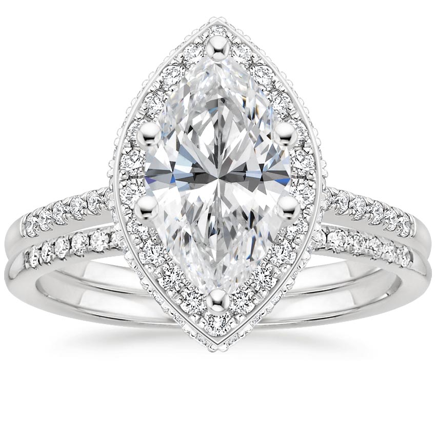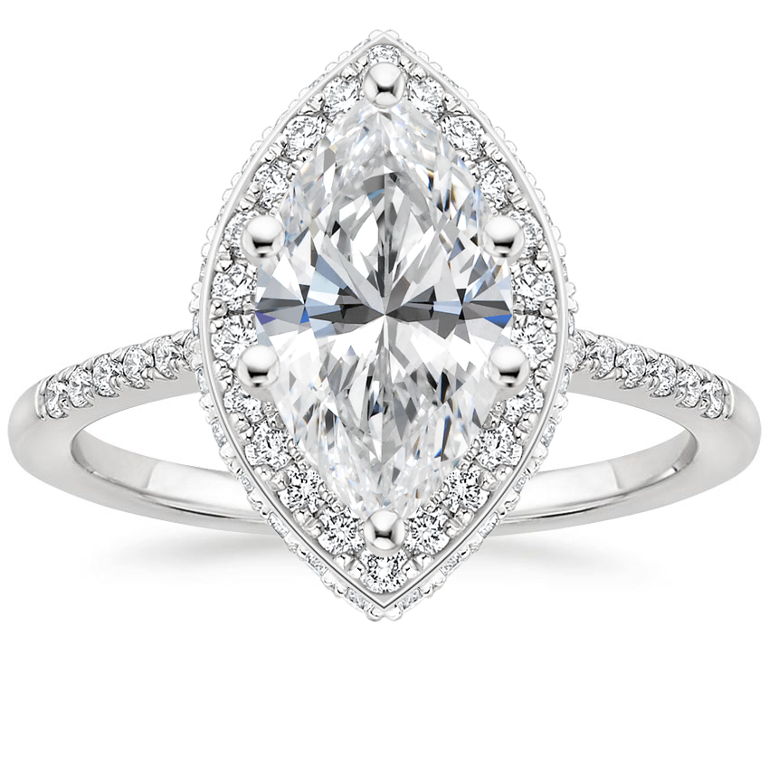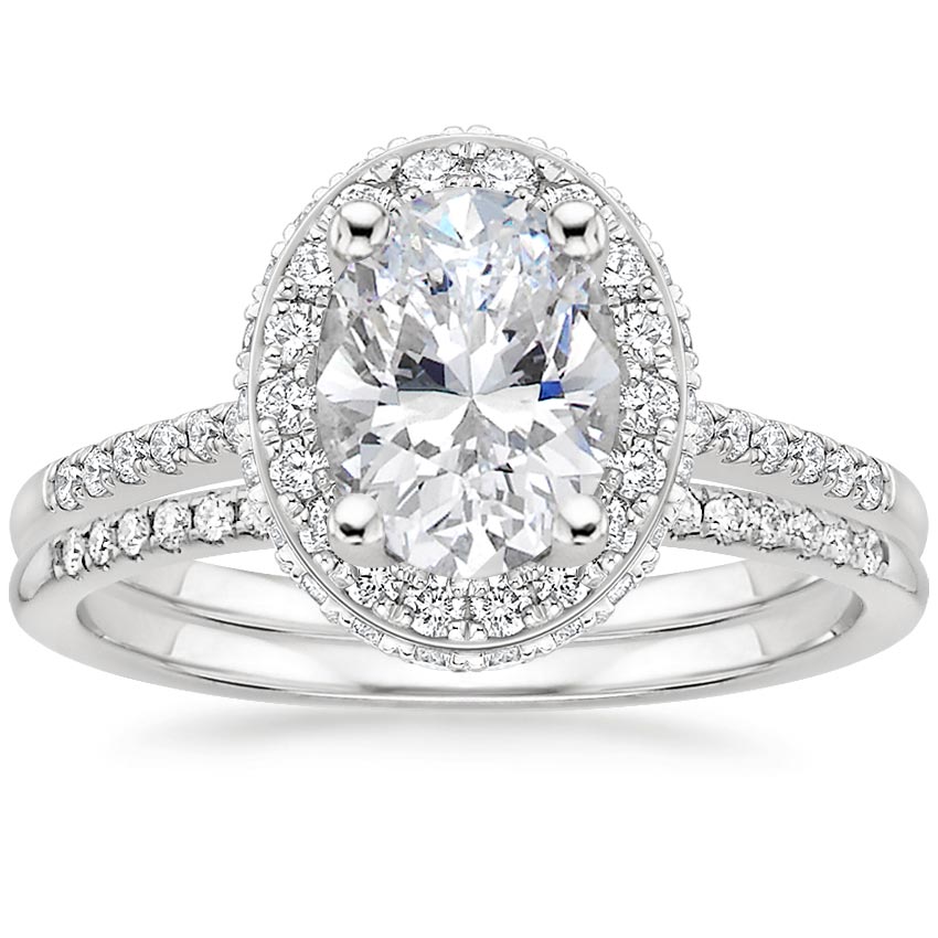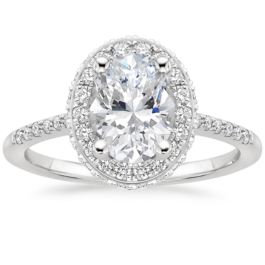 This lavish setting is adorned with shimmering diamonds along every angle. Two rows of pavé diamonds sparkle around the center gem in this unique halo. Shimmering diamond bands complete this look. ... Read More