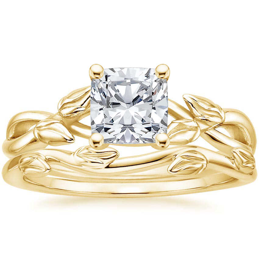 Wispy vines and delicate buds of precious metal entwine toward a brilliant center gem in this stunning engagement ring. The delicately curved matched band creates a beautiful set. ... Read More