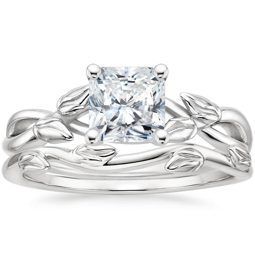 Wispy vines and delicate buds of precious metal entwine toward a brilliant center gem in this stunning engagement ring. The delicately curved matched band creates a beautiful set. ... Read More