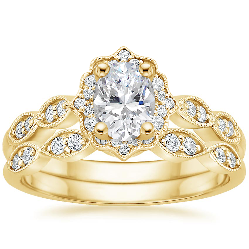 An ornate halo of shimmering diamonds and milgrain encircle the center gem in this breathtaking vintage-inspired bridal set. Pairs of glittering pavé diamonds nestled in marquise-shaped frames adorn the bands, creating a romantic effect.