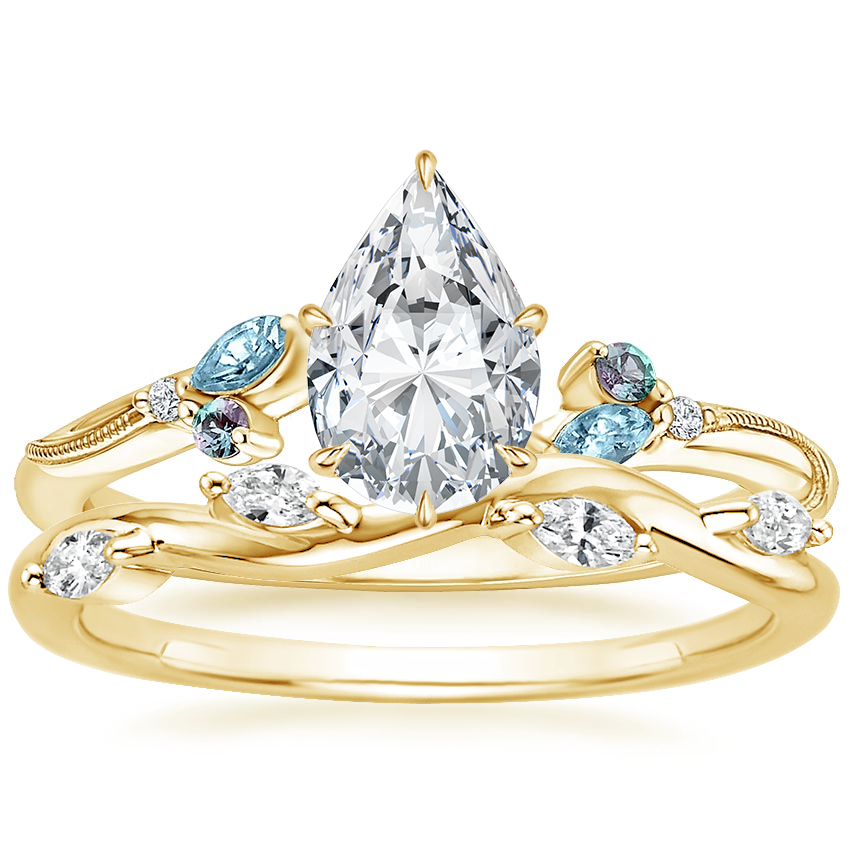 18K Yellow Gold Camellia Indigo Milgrain Ring with Winding Willow Diamond Ring
