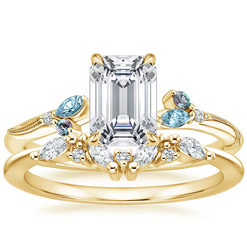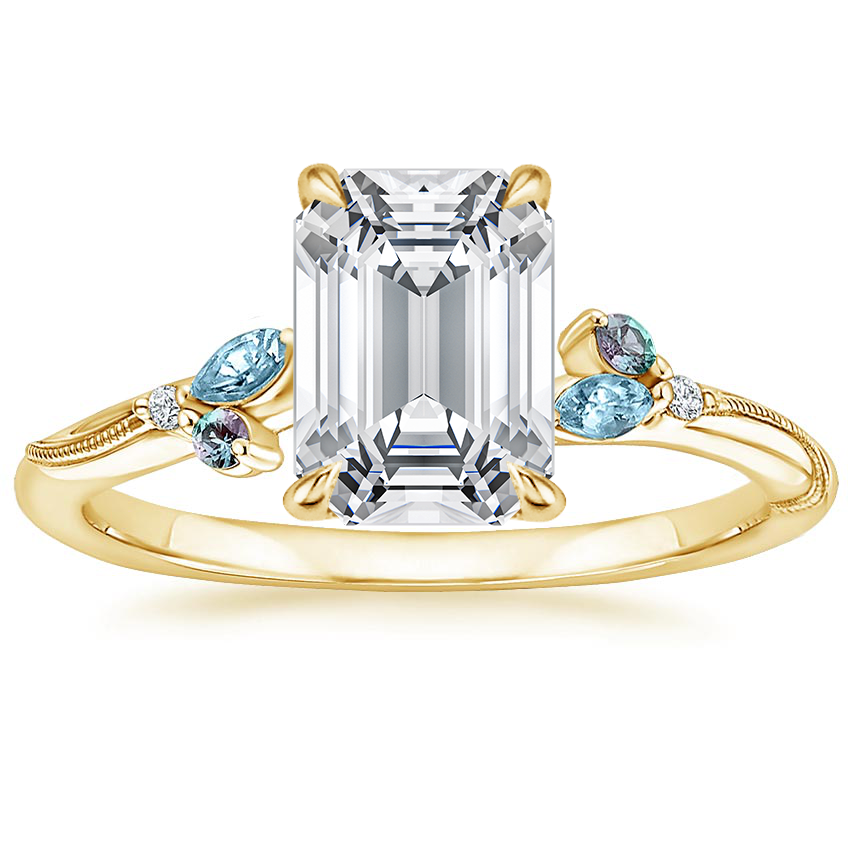 18K Yellow Gold Camellia Indigo Milgrain Ring with Yvette Diamond Ring with 4.19 Carat Emerald Lab Grown Diamond