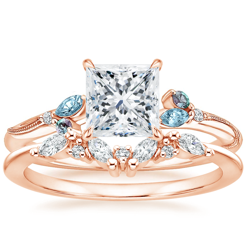 14K Rose Gold Camellia Indigo Milgrain Ring with Yvette Diamond Ring with 1.51 Carat Princess Diamond