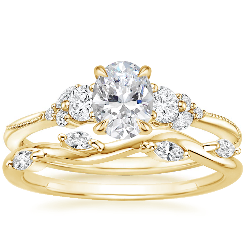18K Yellow Gold Camellia Three Stone Diamond Ring (1/3 ct. tw.) with Winding Willow Diamond Ring