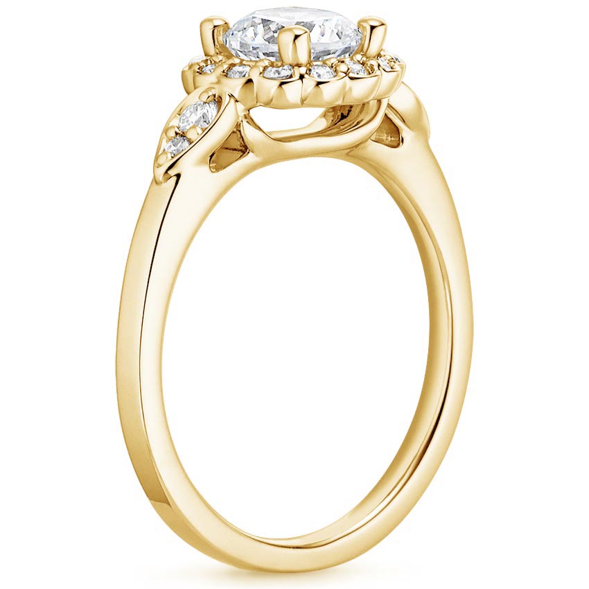 My (now) fiancee has a classic style but wanted something a little different. We had looked at a few unique halo settings at the Boston showroom and she ultimately trusted me to find a ring that matched her. This setting actually caught my eye as I was walking out the door after seriously considering a few others. When I finally proposed, my fiancee was absolutely delighted! She loves how comfortable it is, the scalloped edges of the diamond halo, and the leaf inspired details on the side. The peach sapphire I chose made it even more gorgeous and unique. She said it's her in a ring!