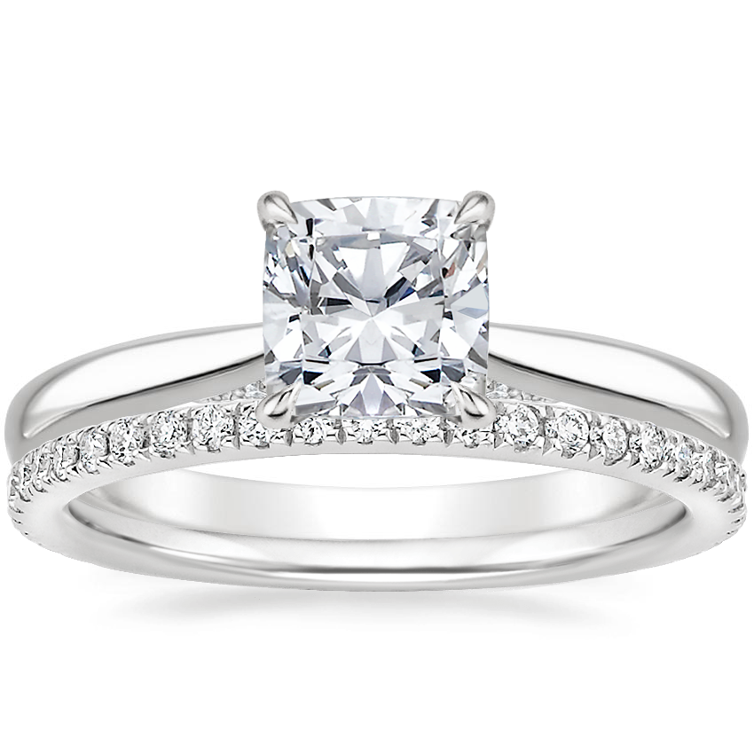 My partner and I picked this ring out and I am so glad we did! We ordered online which was nerve-racking, but we both love the finished product. I love the hidden accents on the ring and I love the thinner band. I would recommend Brilliant Earth and this specific ring to anyone! We ordered a 1.07 carat cushion cut ring for reference. The wedding band is the Brilliant Earth luxe ballad band.