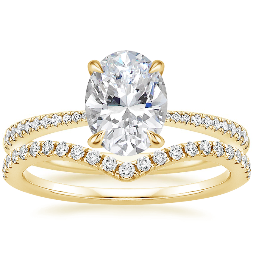 My fiancé proposed to me with this yellow gold Elena ring, and it's so perfect! The band is so dainty and delicate. He added a 2.1 carat lab diamond in oval shape and I couldn't be more thrilled. I get SO many compliments even from the Baristas at Starbucks when I get my coffee.