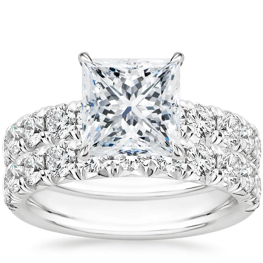 This glamorous bridal set secures the center gem with elegant claw prongs and features French pavé diamonds, a setting style that allows light to reach the diamonds from multiple angles and enhances their sparkle (1 7/8 total carat weight). ... Read More
