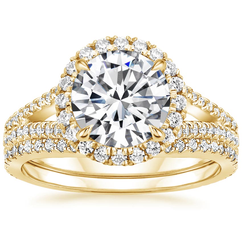 This exceptional setting features a halo of diamond accents that curve gently around the center diamond for a distinctive look. Two rows of pavé diamonds sparkle on the contemporary split shank band, while a contoured wedding band sits flush alongside the engagement ring. ... Read More