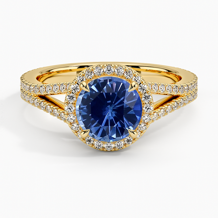 18K Yellow Gold Fortuna Halo Diamond Ring (1/2 ct. tw.) with 6.9x6.8mm Blue Round Sapphire