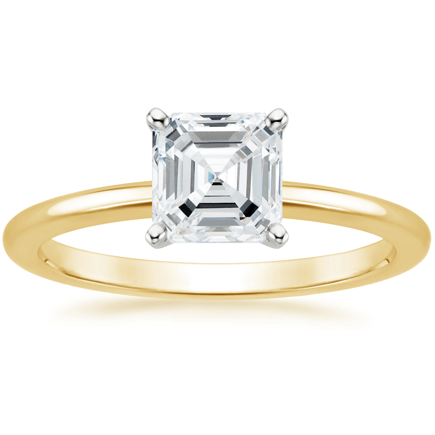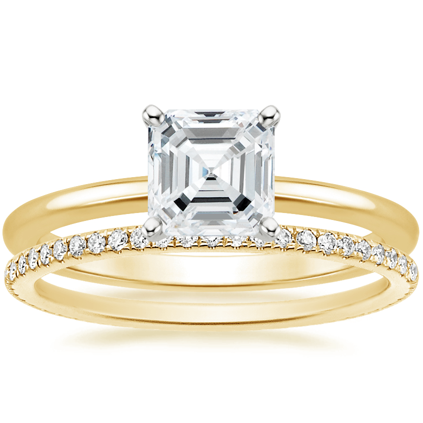 18K Yellow Gold Four-Prong Petite Comfort Fit Ring with Whisper Eternity Diamond Ring with 0.75 Carat Asscher Diamond