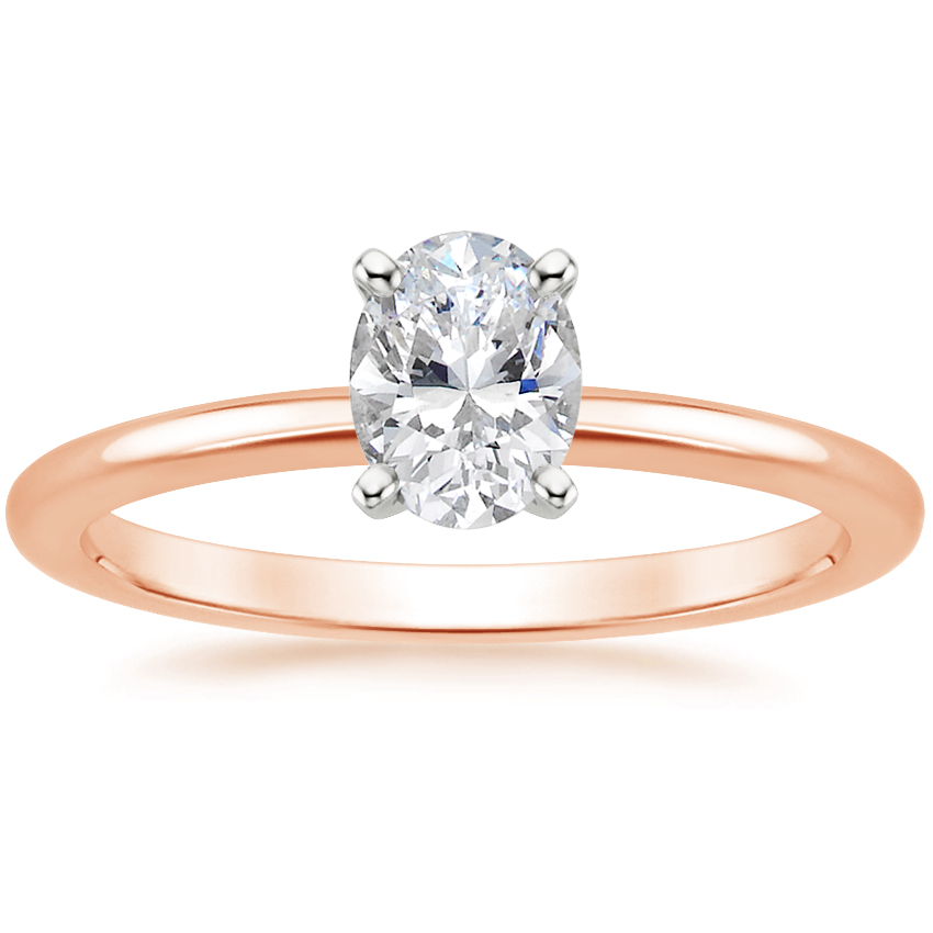 My fiancé knew I wanted a rose gold solitaire ring. I have small hands so I was worried the ring wouldn't be comfortable. I originally wanted rose gold prongs, but the white gold prongs blend in nicely with the diamond. For reference, I wear a 4.5, the diamond is a .8 carat oval with color E. I personally think being so sparkly & clear makes the diamond look bigger than it actually is. I also recommend ordering their ring sizer first - it made for a perfect fit.