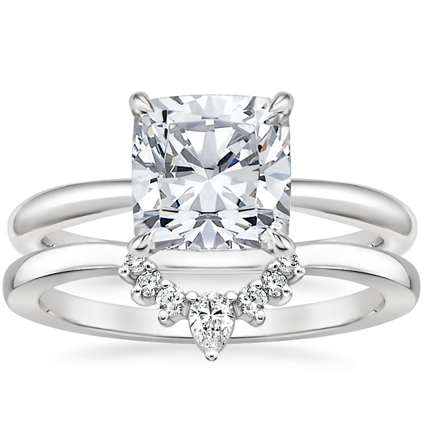 My fiance and I choose the 12x6mm Super Premium Marquise Moissanite to go with the Fressia 2mm solitaire ring. I don't care much about a real diamond and the Moissanite was much prettier than an actual diamond in my opinion. I paired my engagement ring with a 3mm low dome comfort fit wedding band.