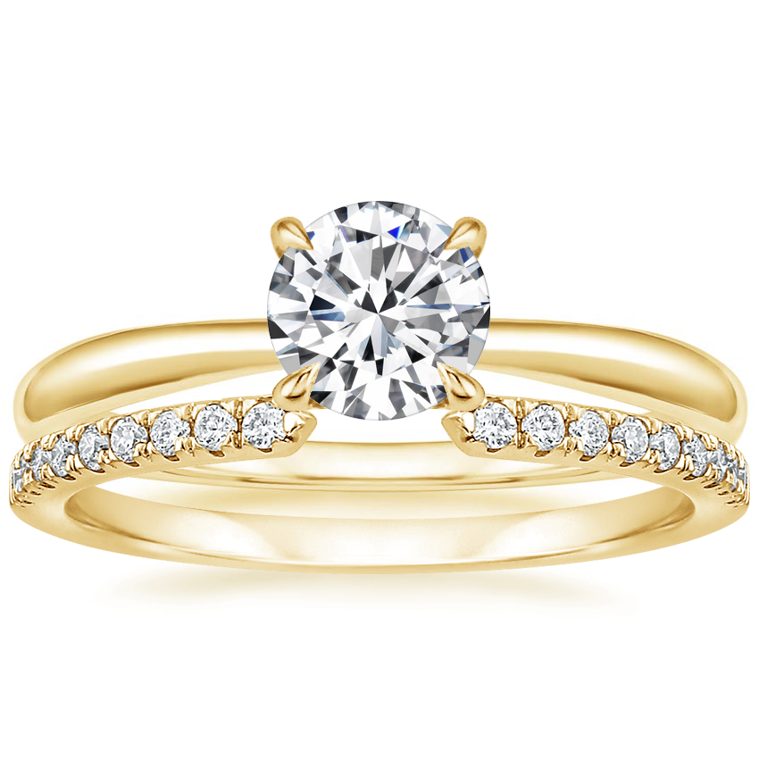 The gently tapering band of this engagement ring is perfectly complemented by a diamond-adorned open wedding ring, creating a what-dreams-are-made-of, timeless bridal set (1/8 total carat weight).