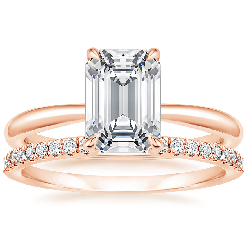 The gently tapering band of this engagement ring is perfectly complemented by a diamond-adorned open wedding ring, creating a what-dreams-are-made-of, timeless bridal set (1/8 total carat weight).