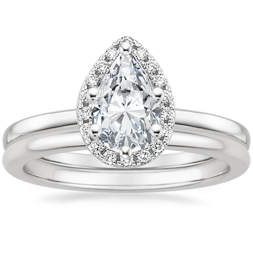 18K White Gold French Halo Diamond Ring with Petite Comfort Fit Wedding Ring